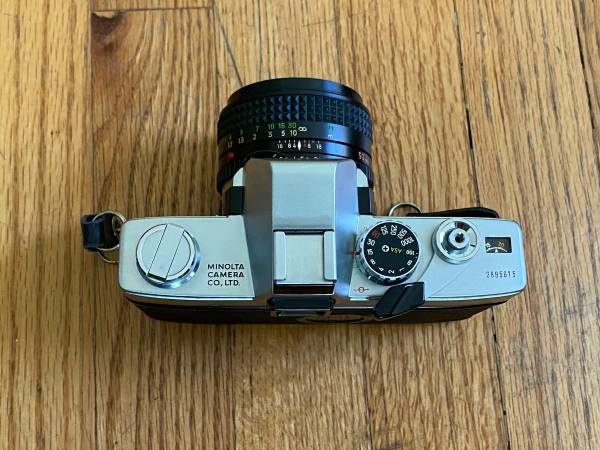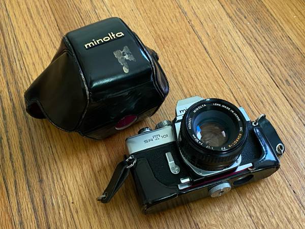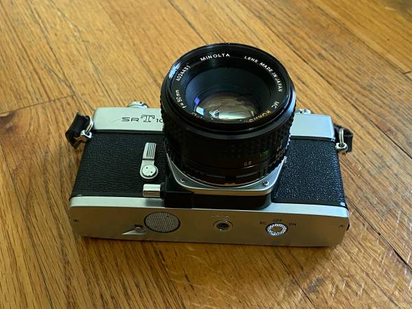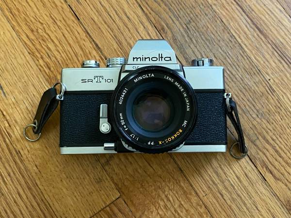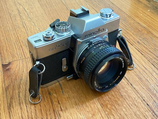 The Minolta SRT-101 is a highly regarded and durable manual 35mm film SLR camera, known for its robust mechanical build quality and its through-the-lens (TTL). It's an excellent choice for both beginners and experienced photographers who prefer a hands-on, classic photographic experience. The camera features a bright viewfinder, mirror lock-up, depth-of-field preview, and the capability to use interchangeable Minolta SR mount lenses.