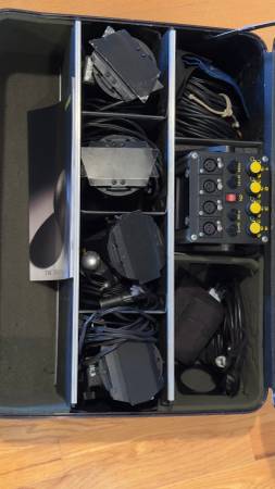 I have Dedo Light kits. They come with power supply for all 4 heads with 4 levels of brightness. 2x extension power cables, 1x back up bulb, 2x sets of metal scrims. 1 kit have an original Dedo case that fits everything ($750), the other has a case, more compact but the power supply does not fit in ($650.00 for this kit). This lights are compact but carry a nice punch due to the mirror in the back and a proprietary lens instead of a Fresnel system that concentrates the light in the most even pattern with no falloff or hot spots. The kits have been just serviced and put up to specs at Dedo California for this sale, I will supply proof of this service upon request.