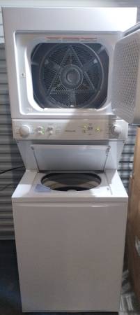 White Frigidaire Heavy Duty-Super Capacity stacked washing machine/gas dryer combo unit with Quiet Pak Plus and Electronic Moisture Sensing technology. This stack unit includes delivery and installation and comes with a 1 year warranty. Great deal!