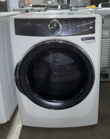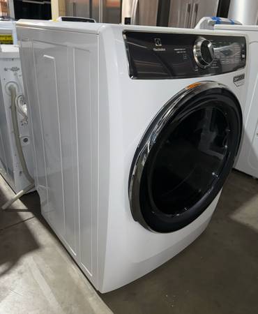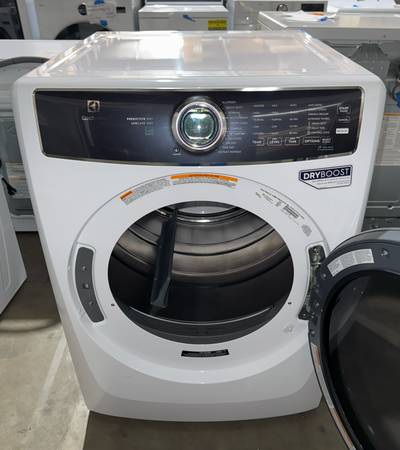 The Electrolux ELFG7637AW is an 8.0 cu. ft. front load gas dryer built for performance, fabric care, and convenience. Featuring LuxCare® Dry technology with advanced moisture sensors, it ensures clothes are dried evenly without over-drying, while the Perfect Steam™ option gently releases wrinkles and reduces static for effortless finishing. The Predictive Dry™ system accurately estimates drying time, so loads are ready when you are, and the spacious stainless steel drum easily handles bulky bedding or family-sized laundry. With 11 versatile cycles, an interior drum light, ENERGY STAR® efficiency, and a reversible door for flexible installation, this dryer combines powerful drying performance with smart design to simplify your laundry routine.