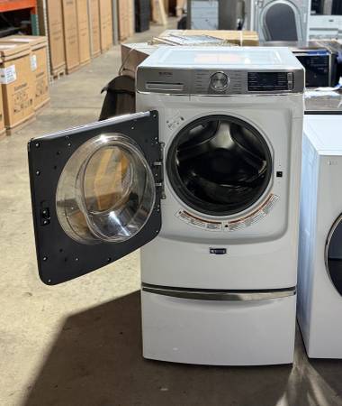 Maximize your laundry space and cleaning power with the Maytag MHW8630HW 27″ front load washer, paired with the XHPC155XW stacking kit for a secure, space-saving vertical installation. This high-efficiency washer features the Extra Power button to tackle tough stains, a Quick Wash cycle for small loads in a hurry, and Fresh Hold® technology to keep clothes fresh for up to 16 hours after the cycle ends. Advanced Vibration Control™ keeps operation smooth and quiet, while the durable stainless steel wash basket ensures long-lasting performance. ENERGY STAR® certification helps reduce utility costs without sacrificing results.