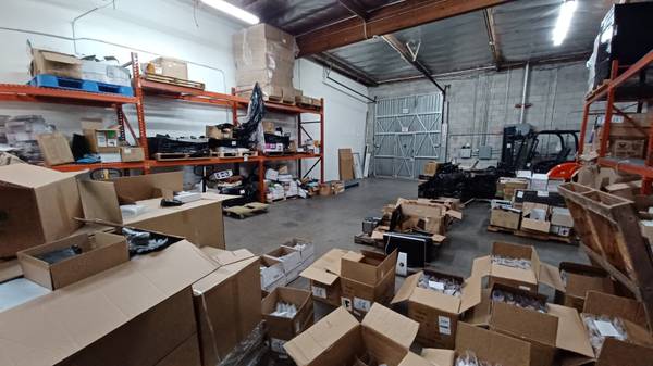 Warehouse for Rent – Canoga Park: - Warehouse: 1,200 sq. ft. - Parking Lot: 1,560 sq. ft. - Includes: • 21 large pallet shelves • Electric forklift • Standard weight scale