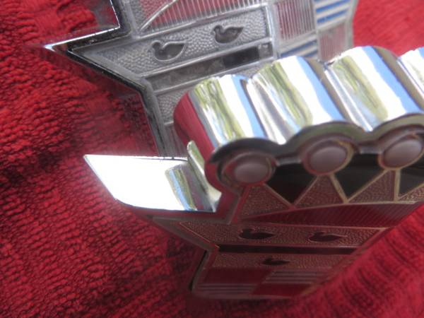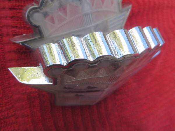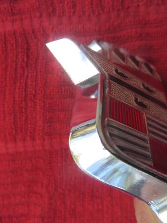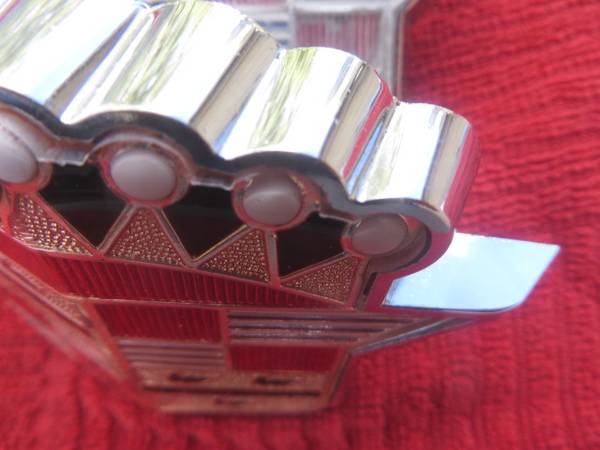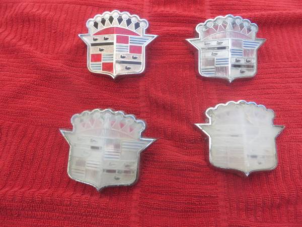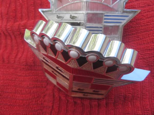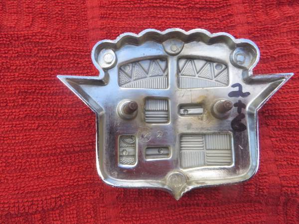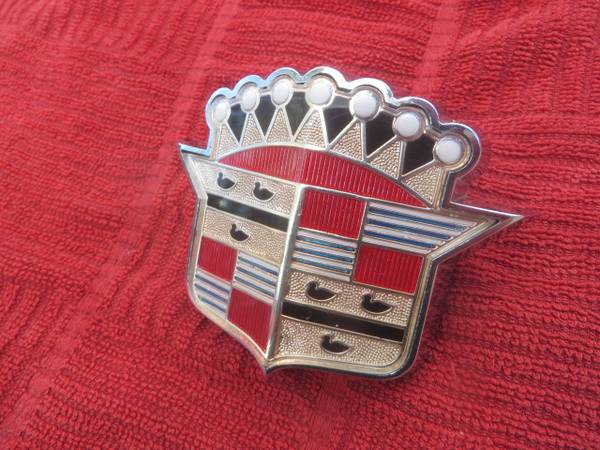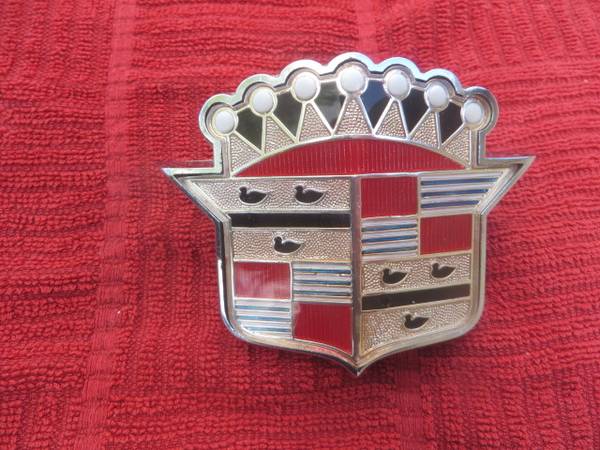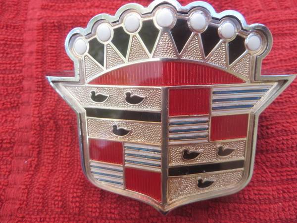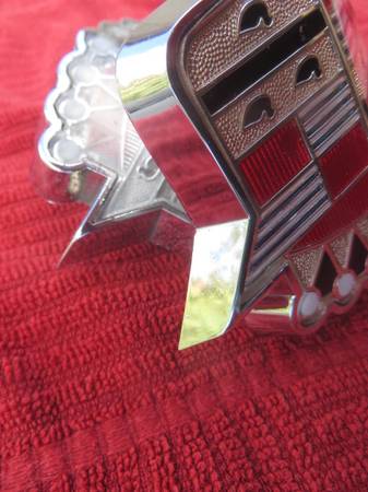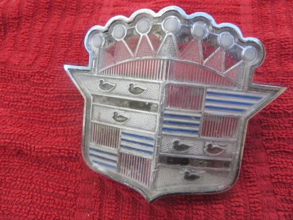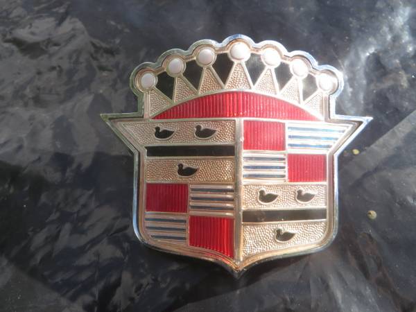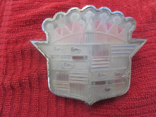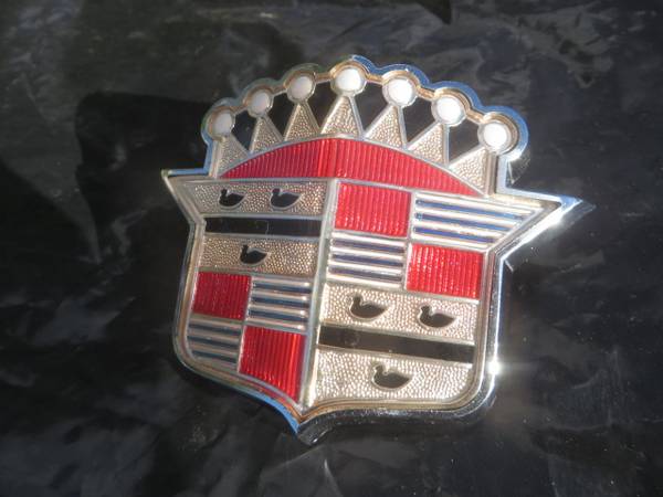 1951 Cadillac hood crest for all models. The chrome bezel is an excellent original with very light pitting, too nice to re-plate except if you're building a show car. The plastic crest is a very accurate NEW reproduction item from many years ago, and now out of production. Price is $850.00 for both the bezel and crest. show contact info