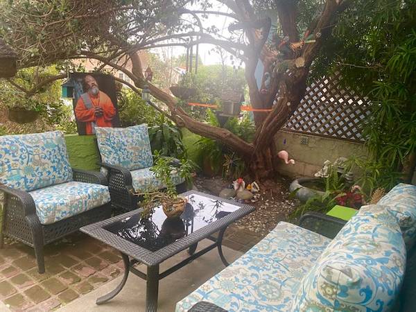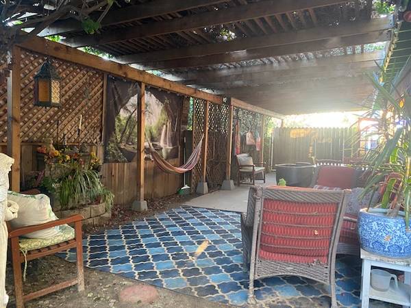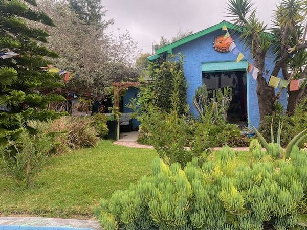 I have a partly or completely unfurnished unit coming available within a shared Burbank home with a private entrance. You would come through gate at top of drive, walk through a beautiful patio that your windows look out on and enter through a private entrance at rear of home. Or you can use the front door near the kitchen. The wood door you see pictured with the green wall around it leads first into a smaller room that serves as a simple kitchenette/office. That room leads into an extra large studio/bedroom. The large master bathroom can be entered from both the small and large room. The exterior bathroom door leads to a shared washer and dryer under a roof outside main kitchen. Living in this unit can be entirely private with no shared interior space with homeowner or sharing common house kitchen and front entrance as you prefer.
