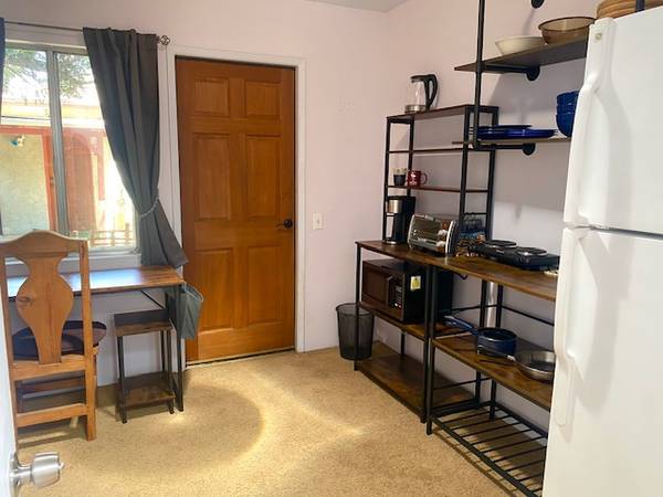 There is a fully fenced yard so a dog is possible as well as cats. Currently the unit has a super comfortable queen size bed with 4 large drawers below if you want this. There is a full size refrigerator and a few food prep appliances provided. While there is a simple kitchen set up in your private unit, you would also have access to the shared house kitchen as you like and access to its additional supplies and the full size oven/range. The large bedroom has a large walk in closet with built in shelves and lots of hanging space and there is a small closet in the small room.