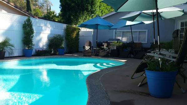 One quiet fully furnished bedroom with a king size memory foam mattress bed with direct bedroom access to shared bathroom within a large upscale three-bedroom, two-bathroom Encino home (with a large and very private swimming pool, hot tub). The bedroom is approximately 12' X 12'. This is a very safe neighborhood within Encino. This post is for only one person to rent one room in an owner-occupied house, NOT for a couple and not renting the entire house.