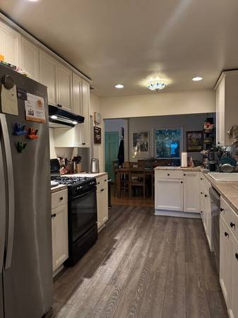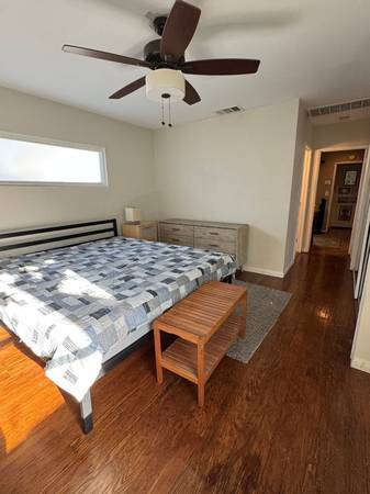 Master bedroom with private full bath and adjoining office for rent in spacious private home. Bedroom is furnished with king bed, dresser, armchair, bookcases, desk, and direct access to the back deck. Separate room for office with desk, shelf, loveseat. Hardwood floors, central heat/air, and wireless internet. Shared access to kitchen, dining, living room, laundry. Home is shared with two creative professionals. Quiet North Hollywood neighborhood, walkable to shops, restaurants, theater, parks, and bike paths..PLEASE LEAVE YOUR PHONE NUMBER and tell me a little about yourself, and I'll get back to you as soon as possible.