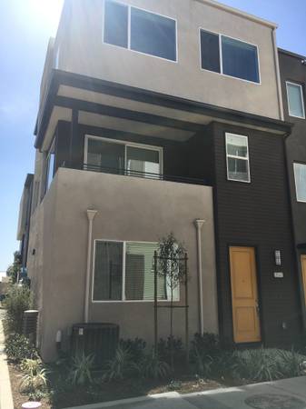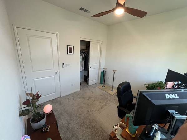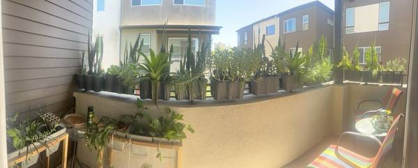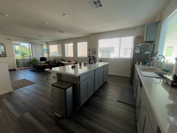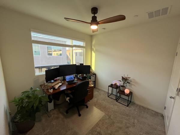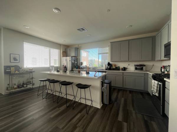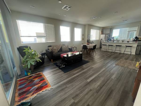 House built in 2021. Bedroom is unfurnished (furnished pictures also shown just to give you a better idea), but the main area is furnished with the 75 inch TV + entertainment stand, dining table, couch, coffee table, bar chairs, patio furniture, kitchen items, etc! Bedroom has remote-controlled overhead fan + light, helpful for good sleep. Washer + dryer on 3rd floor. Utilities not included (wifi, gas, electric, water + garbage estimated to be around $40-50 per person per month if split by 4 people). Solar panels on the roof help keep electric very low (see last picture) as a bonus.