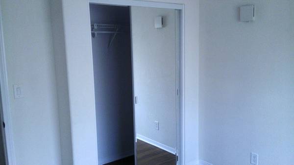 Mirrored sliding closet doors (upper shelf, upper and lower racks for clothing storage