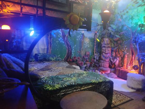 Voted the most creative house ever. Perfect for someone that makes art, music, videos and all things creative. This laid back environment's prime directive is a place where artists get along, inspire, admire and collaborate. Other rooms here are the Spaceship Room, Zen Room, and Hippy Haven. A green screen studio is onsite and a very large backyard for those that love trees and nature.