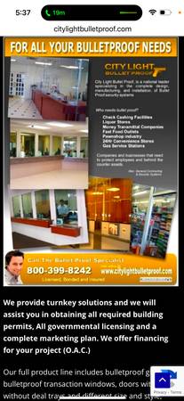 City Light Bullet Proof, is a national leader specializing in the complete design, manufacturing, and installation, of Bullet Proof security systems City Light Bullet Proof has many years experience providing security solutions and peace of mind to financial institutions, check cashing facilities, pay day loan industries, liquor stores, money transmittal companies, fast food outlets, and the pawnshop industry.