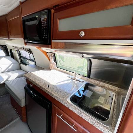 • Fully self-contained: two-burner propane cooktop, microwave, sink, 3-way fridge