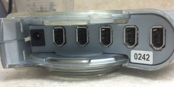 - Green-colored LED indicates that a powered FireWire device is attached to the Hub