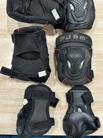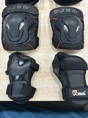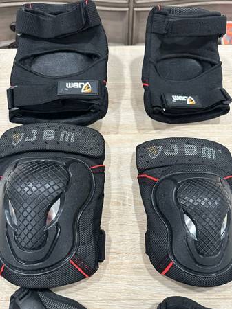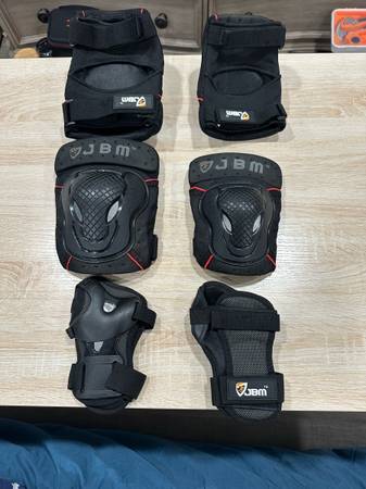 The image shows a JBM protective kit consisting of knee pads, elbow pads, and wrist guards. This type of protective gear is commonly used for cycling, skateboarding, inline skating, and other similar activities.