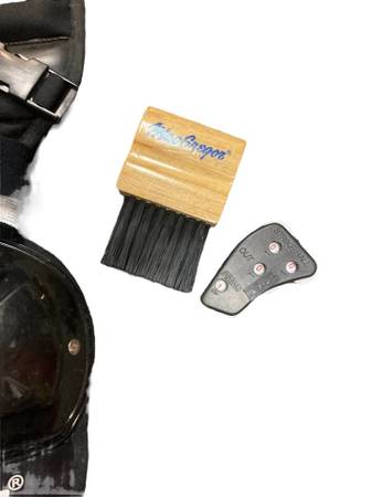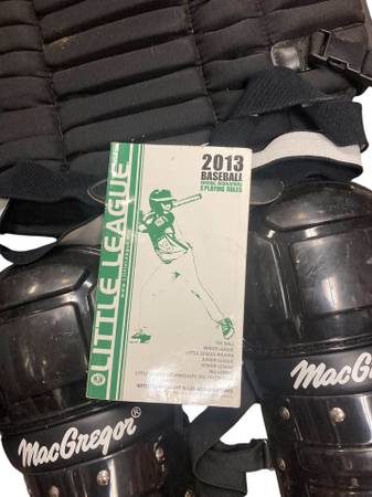 Comes with everything you need to start calling games. Set is in like new condition, was only worn a few times. As far as sizing goes, I measured the shin guards at 16". The chest protector is...