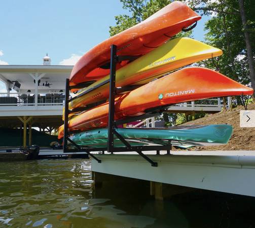 Brand new in unopened box; adjustable kayak rack from Store Your Board that fits onto a dock. Adjust the levels to holds an array of recreational, whitewater, tandem, and fishing kayaks. It also holds paddleboards and some canoes. This rack keeps your watercraft ready for adventure and right where you need them.