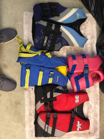 Included 2 youth vests and 2 kids vests- $10- 30 each. Orange vests $10 each. Trailer hitch with locks $15 Water ski $20 OR all items $100
