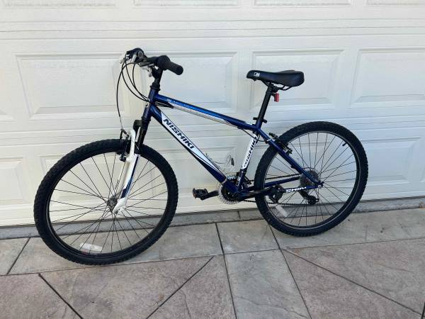 Pre-owned Nishiki Pueblo mountain bike; small adult frame size. Fits adult or child riders 5'3" to 5'7". 26" tires, Durable steel frame, Shimano 7-speed twist shifting, front fork suspension,...