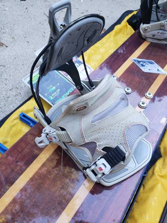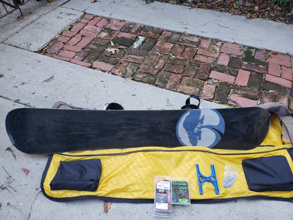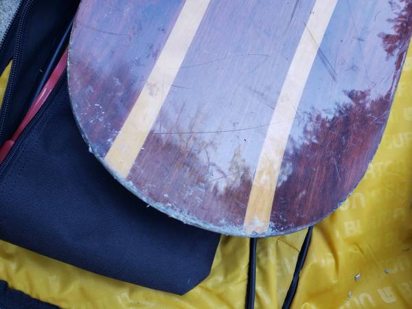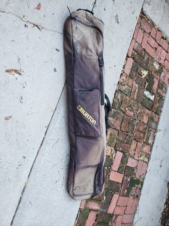 Vintage Burton custom board, classic freeride all-mountain setup likely from mid 2000s to early 2010s with wood topsheet, strap-in bindings and overall good condition, about 152-154 cm long. A few chips and one small area of delamination. The cover is sun damaged on the outside but zippers work and inside is in good condition. Sold as is.