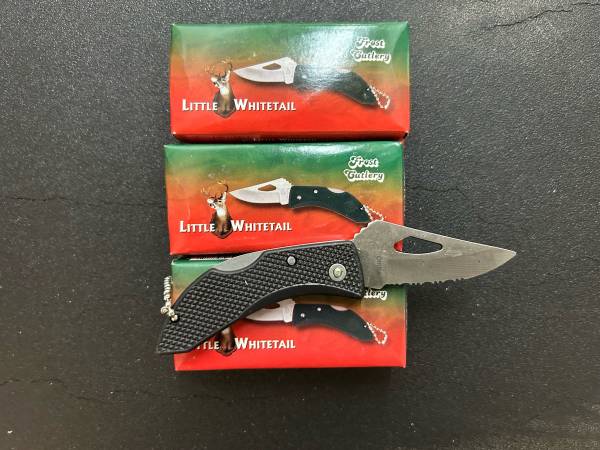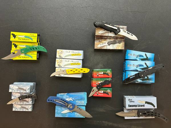 Pocket Knifes Various Sizes and lenths Quantity Name Size 6) Little White Tail 2 ” 5) Big Blue 3 ” 3) Swamp Lizard 3.5” 10) Fire Fly 2” 4) True 3 ” 7) The Vulture 3.5” 3) Old Yellow 3 ” 5) Night...
