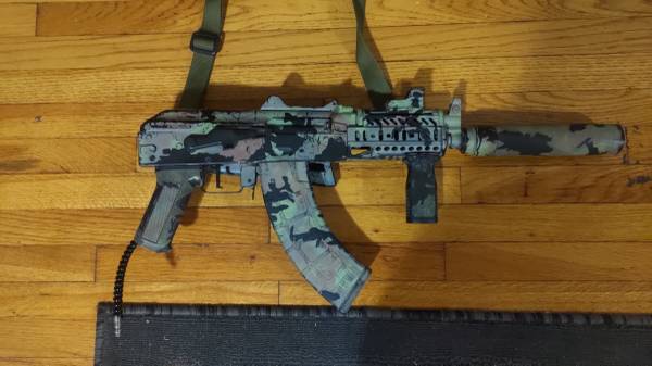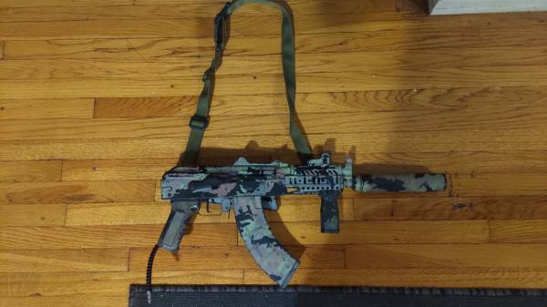 Up for sale is a custom built HPA aku, with a working suppressor, can be screwed on and off for desire of play, custom painted by me airbrushed did not seal the paint because I enjoy the warn look, can easily be wiped off, magazines have been painted also as well as the suppressor, grip has been stippled also, and also has a metal flat trigger, very well taken care of one of my favorite builds and it even comes with a Novristh micro Red Dot that is capable of taking point blank shots without breaking and still has not broke, 2032 battery runs beautifully, runs off a 3.7 lipo that fits into the grip and the hose comes out the bottom of the grip lots of time put into this