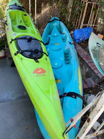 The blue one is a tandem, green is a single with two hatches. I have the seats and life vests. I have had a lot of adventures with both of these boats. Pick up locally only. $650 both.