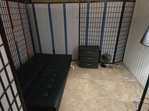 Functional furnished private first floor screened-off space furnished with futon sofa and dresser in gated Valencia (Santa Clarita) townhouse. Has travertine floor and shares an upstairs hallway bathroom with skylight & jacuzzi. Available on a fixed term, one month basis, renewable if mutually agreeable. $600 per month, $100 deposit, utilities included. One person. Microwave & toaster oven cooking only.