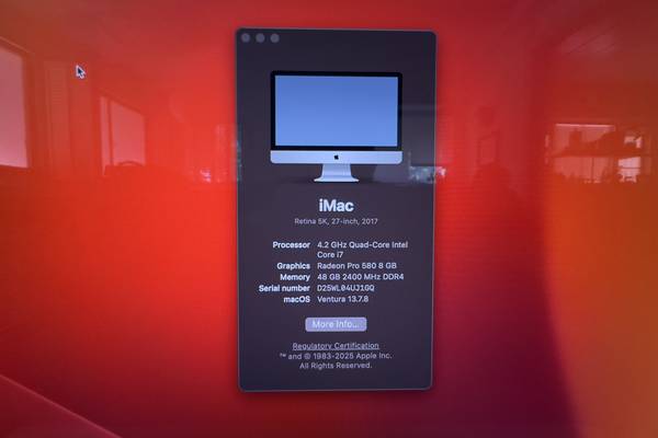 iMac 27” Retina 5K/4.2GHz i7/8GB Graphic/48 GB RAM/1 TB SSD -...
