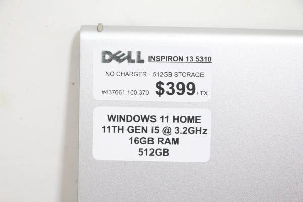 We are selling our Dell Inspiron 13 5310 Laptop. This laptop does not come with charger. Specs include: 512GB, Windows 11 Home, 11th generation i5 @3.2GHz 16GB RAM. Please call or text with questions show contact info