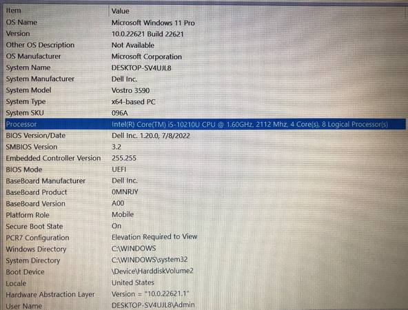 • Model: Vostro 3590 – 10th Generation • Operation System: Windows 11 Pro 64 Bit • Processor: Intel Core i5-10210U CPU @ 1.60GHz / Quad Core – 8 Logical Processors • CPU Speed: 1.60 GHz • Microsoft...