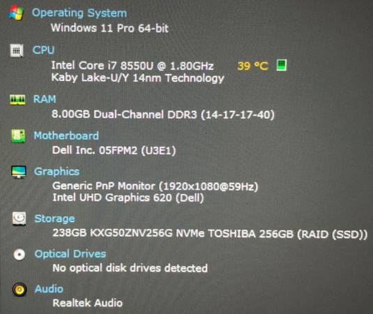• Processor: Intel Core i7-8550U CPU @ 1.80GHz – Quad Core, 8 Logical Processors