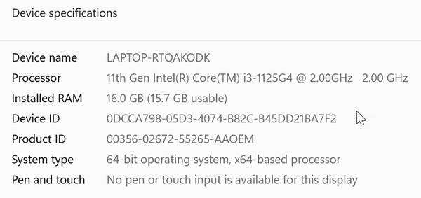• Processor: Intel ® Core ™ i3-1125G4 CPU @ 2.00GHz – Quad Core, 8 Logical Processors