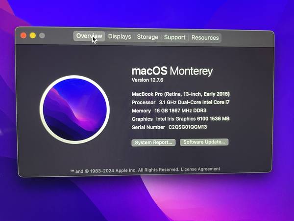 APPLE MACBOOK PRO A1502 13 INCH SCREEN 3.1 DUAL INTEL i7 !!! 16 1GB DDR3 500 GB HD OS MONTEREY 12.7 EXCELLENT CONDITION GREAT FOR SOMEONE ON A BUDGET FOR GENERAL TASKS COMES WITH OEM POWER SUPPLY