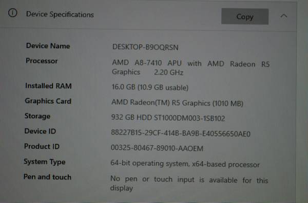 AMD A8-7410 APU w/AMD RADEON RS GRAPHICS 2.20 GHz. 64-BIT OPERATING SYSTEM X-64 BASED PROCESSOR