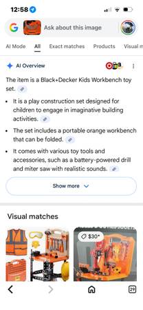 Kids toy construction set includes folding portable work bench and several tools, some with battery powered sounds. Like new condition. Located in Burbank, near Alameda and Buena Vista. Exact...