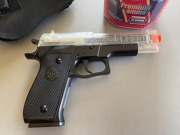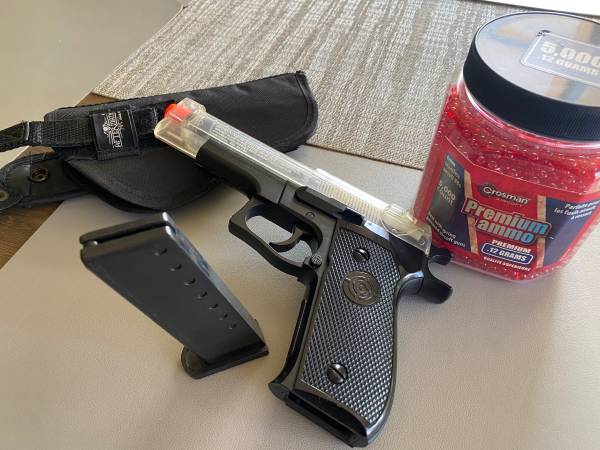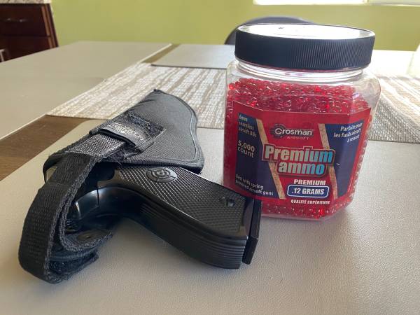 BB gun in a great working condition. Barely used. Includes the holster and the pellets. Gun comes with a safety lock.
