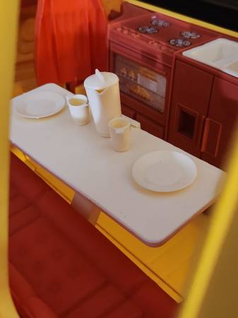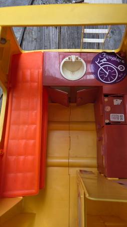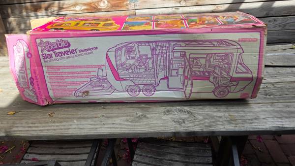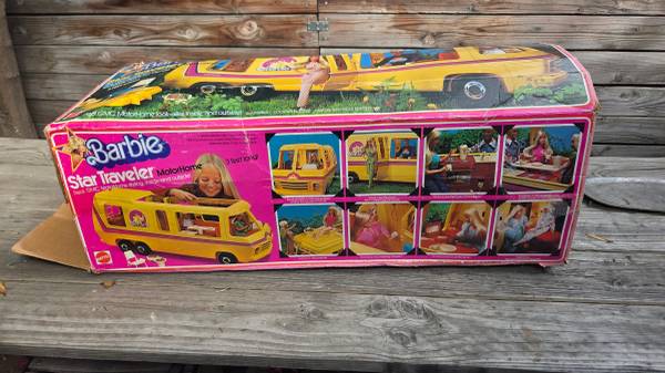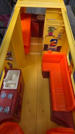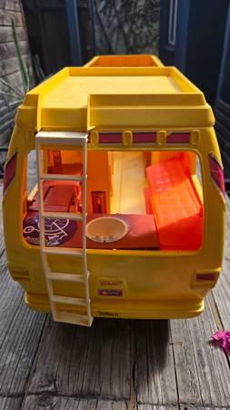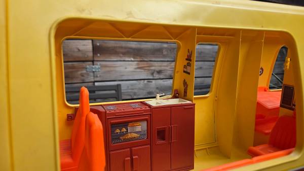 The Vintage Barbie Star Traveler Motor Home is a 3-foot long plastic camper bus in a vibrant yellow color, manufactured in 1976 by Mattel.