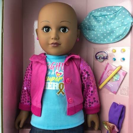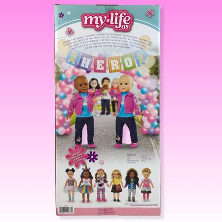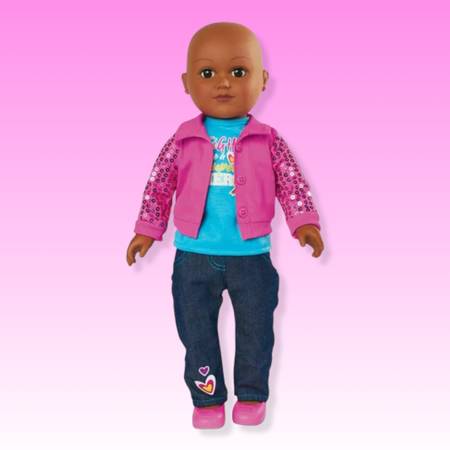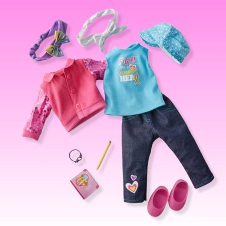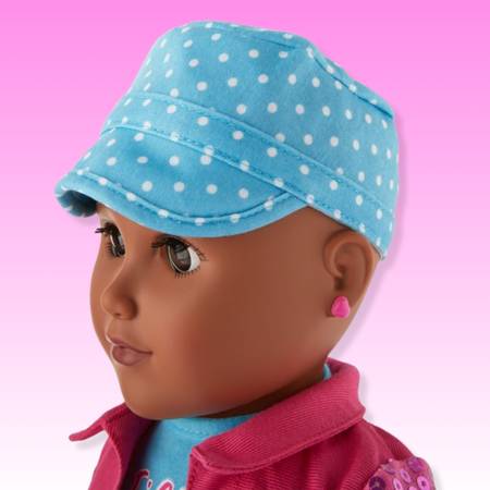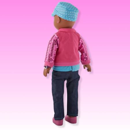 This Doll's outfit includes a blue t-shirt with inspirational hero message, pink jacket with sequin sleeves, pants with heart designs, and pink shoes.