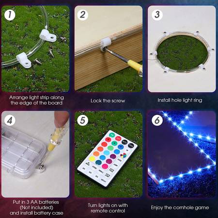 ?Package includes?: 2 x cornhole ring lights and 2 x cornhole edge lights, 1 x 32-key remote control, 2 x waterproof battery case (AA batteries are not included), 1 bag of cable clips, 1 bag of screws; Fit the size of the regulation size (4 ft x 2 ft) cornhole board