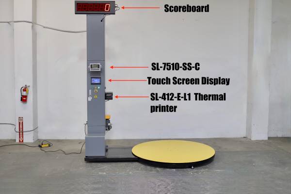 Used Pallet Wrapping Machine w/ Built-In Scale – 5,000 lb Capacity Heavy-duty stretch wrapper with integrated weighing system. Wrap and weigh pallets at the same time — no re-weigh fees. Specs: 5'...