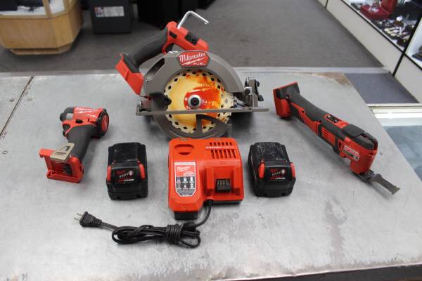 PRE-OWNED MILWAUKEE THREE CORDLESS TOOL KIT INCLUDES MILWAUKEE 2834-20 M18 7-1/4 CIRCULAR SAW MILWAUKEE 2626-20 M18 OSCILLATING MULTI-TOOL MILWAUKEE 2953-20 M18 1/4 HEX IMPACT DRIVER MILWAUKEE RAPID...