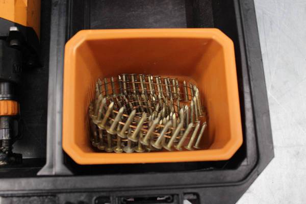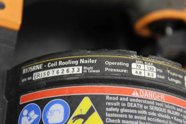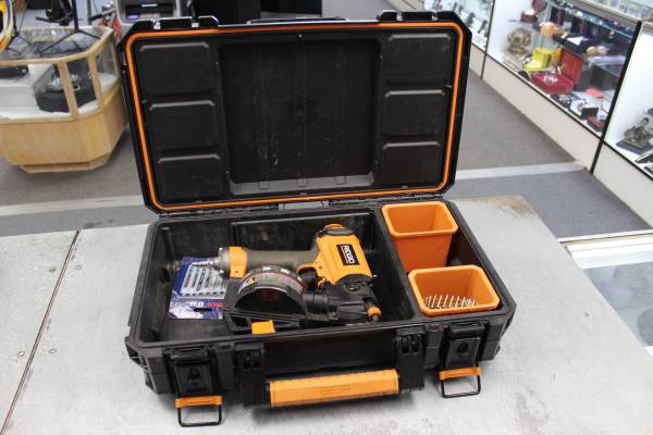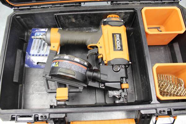 PRE-OWNED RIDGID R175RNE PNEUMATIC 15° 1-3/4" ROOFING NAILER INCLUDES A CARRYING CASE ALONG WITH SOME EXTRA NAILS STK #17695100 DO NOT EMAIL, PHONE CALLS ONLY (NOT ON SUNDAY)