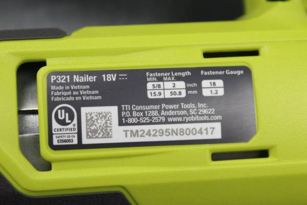 PRE-OWNED RYOBI P321 18GA BRAD NAILER (TOOL ONLY) IN ORIGINAL BOX STK#1103702 DO NOT EMAIL, PHONE CALLS ONLY (NOT ON SUNDAY)