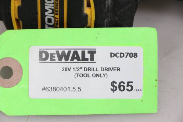 We are selling our Dewalt 20V 1/2" Drill Driver DCD708 (Tool Only). This drill driver does not come with battery or charger. Please call or text with questions . Please reference Stock # 6380401...