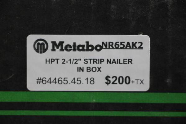 We are selling our Metabo HPT 2-1/2" Strip Nailer NR65AK2. This nailer comes with original box and safety glasses. Please call or text with questions . Please reference Stock # 64465 when you call....
