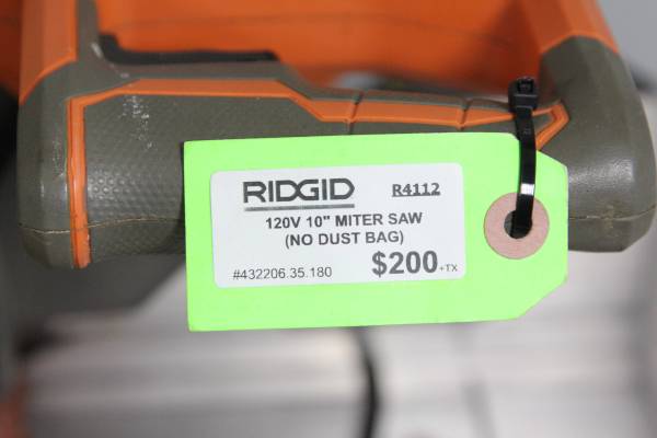 We are selling our Ridgid 120V 10" Miter Saw - No Dust Bag - R4112. This item shows heavy signs of use. Please call or text with questions . Please reference Stock # 432206 when you call. ppc