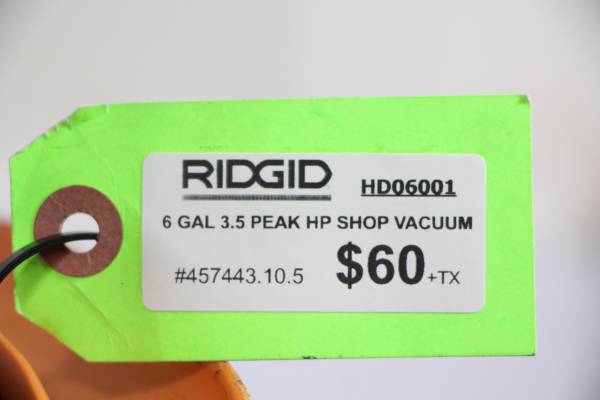We are selling our Ridgid 6 Gallon 3.5 Peak HP Shop Vacuum HD06001. Please call or text with questions . Please reference Stock # 457443 when you call. ppc