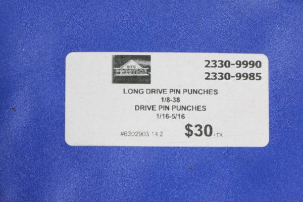 We are selling our RTS Prestige Long Drive Punches 1/8 - , Drive Pin Punches 1/16 - 5/16 2330-9985. Please call or text with questions . Please reference Stock # 6302903 when you call. ppc