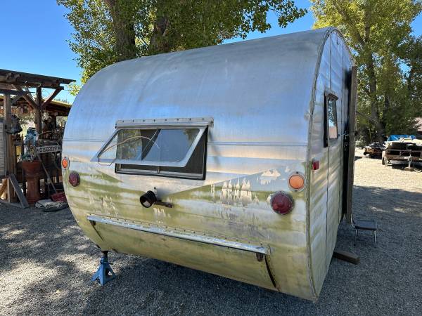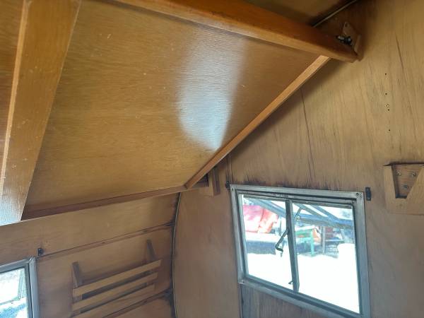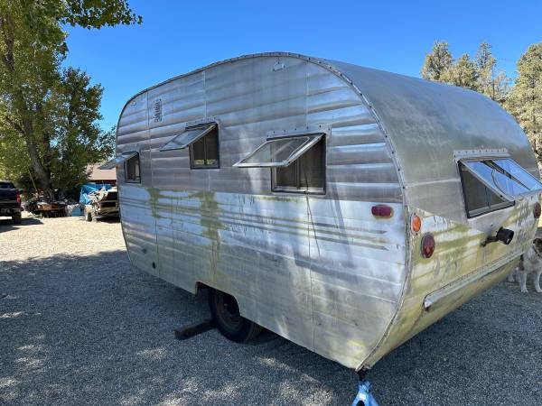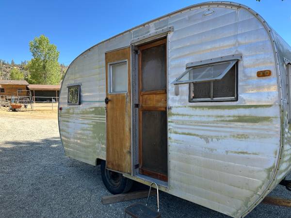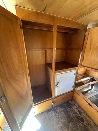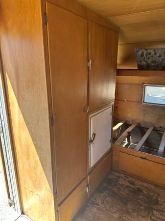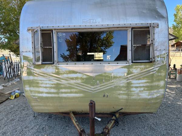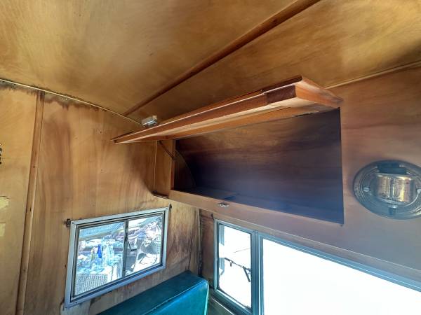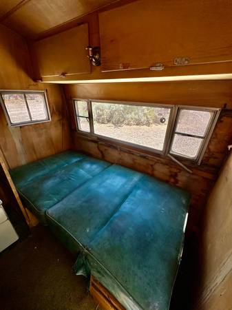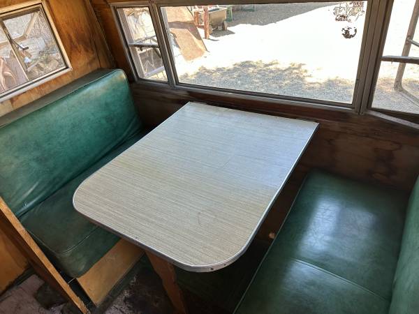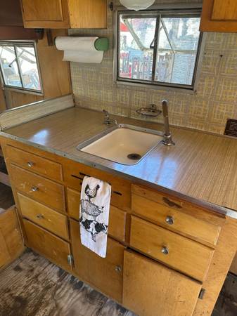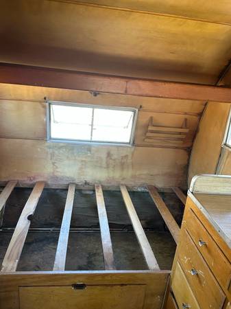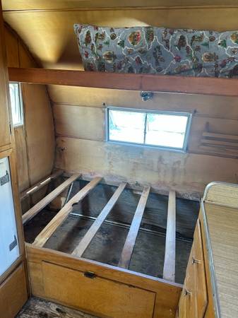 Ready to create your style, just cleaned and oiled all wood surfaces. Has 3 beds (dining table drops down for sleeper, full size back bed and drop down bunk!) All windows work with screens. Has new tires and measures 13'5 with tongue otherwise entire length is 15'10.
