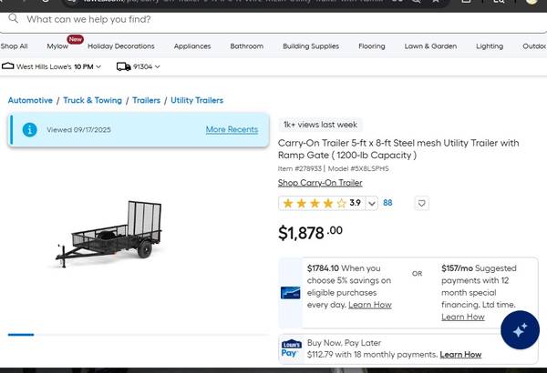5' x '8 ID Trailer Utility Trailer with Ramp Gate 1200-lb Capacity low miles. Ramp gate Originally purchased from Lowes...